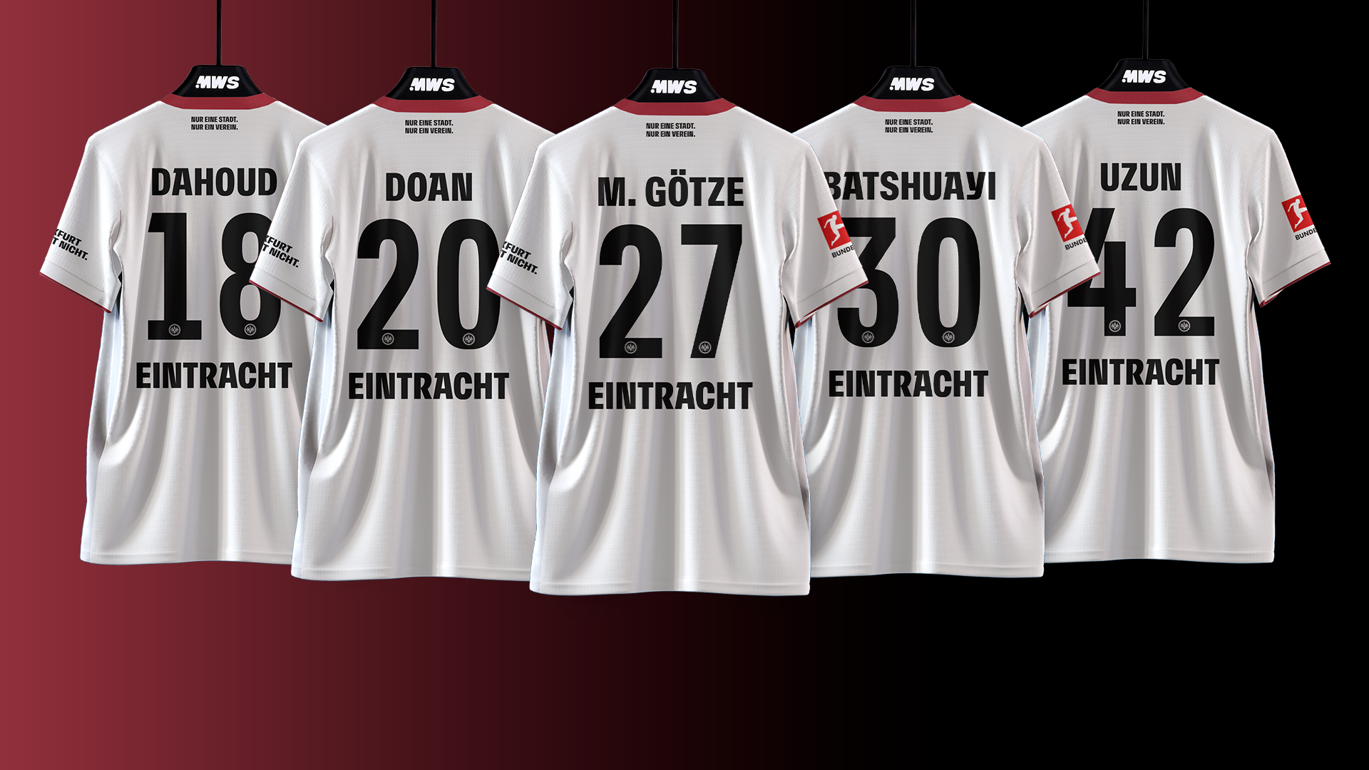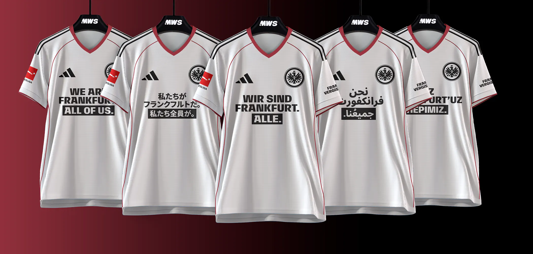 The player name and number on a regular shirt tells you who wore it. On these shirts, there's a small but meaningful addition. Where the sponsor logo normally sits, every shirt carries the words: "Wir sind Frankfurt. Alle."